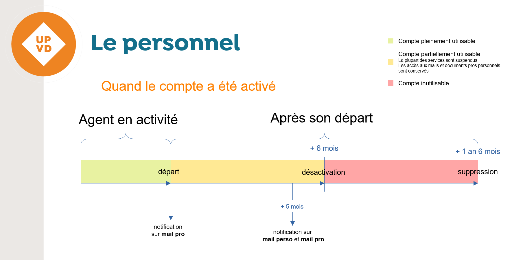 Puis vient un point marqué "départ". À ce moment, une notification est envoyée à l’adresse professionnelle de l’agent. La couleur de la ligne de temps passe au jaune un peu plus soutenu, signifiant que le compte est partiellement utilisable. La plupart des services sont suspendus, mais l'accès aux emails et documents personnels professionnels reste possible. Cette phase dure six mois.
